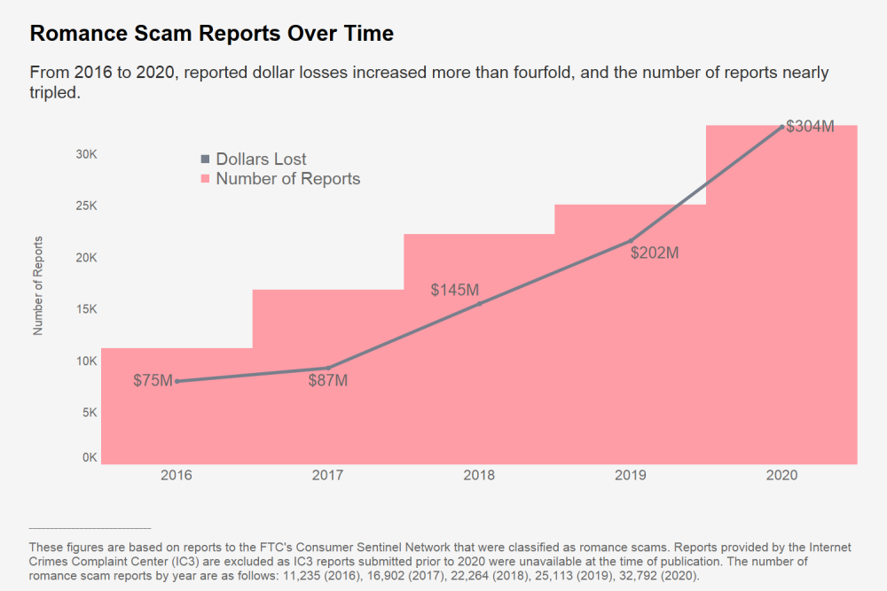 In fact, romance scams doubled in 2020 and cost the average victim $2,500. According to the Federal Trade Commission, total losses were estimated at a record $304 million overall, up about 50% from 2019.